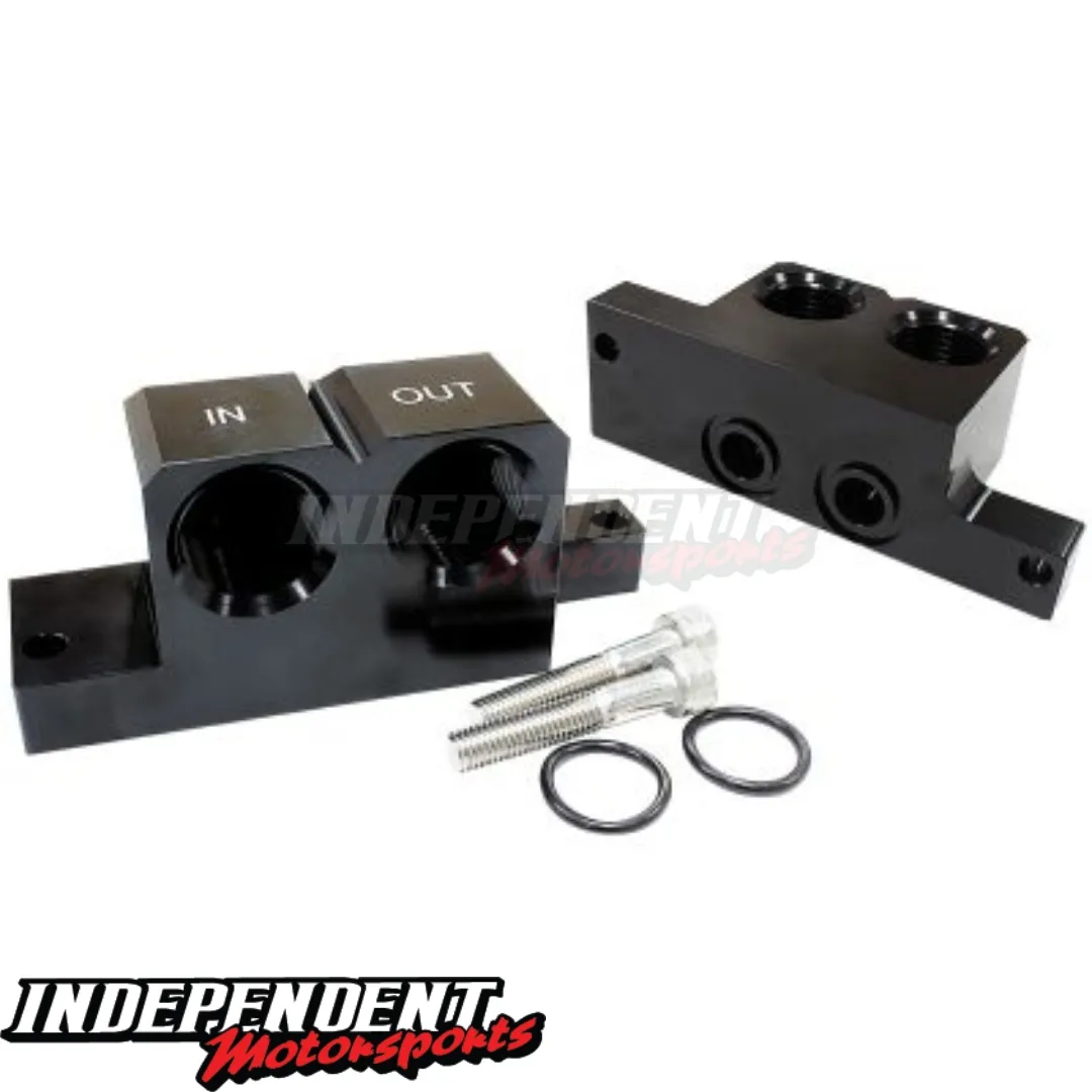 Aeroflow Performance now offer the bolt-on oil block adapter in a 90-degree (horizontal) position. Still retaining the two female -12ORB fittings but with the horizontal outlets is great for tight clearances to run your remote oil filter lines. This block suits Aeroflow LS series front sump oil pan (AF82-2016) and rear sump oil pan (AF82-2012). CNC machined from 6061-T6 aluminium and hard anodised black finish. This oil block adapter is great for those using a left hand starter conversion kits on GM LS series engines.