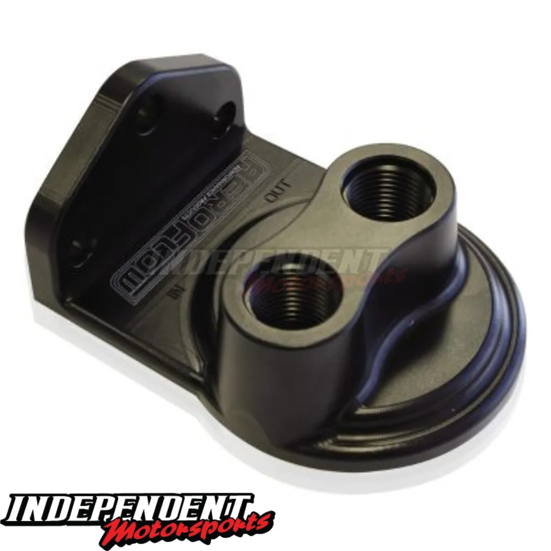 Move your oil filter to newlocation with Aeroflow Performance universal Billet Remote Oil Filter head. This is great for mounting an engine oil filter away from your engine, to make oil filter changes easier or wherespace is limited in the enginebay. Two labelled inlet and outlet -8AN ORB ports are provided for plumbing the engine oil to and from the oilfilter remote mount. The main body is made from billet 6061 aluminium, then anodised blackfor great looks and corrosion resistance. Integrated one piece bracket which can be used to make installation easier in various universal applications.