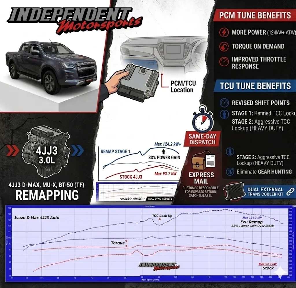 Stop settling for factory lag and indecisive shifting. Our mail-order bench tuning service is designed specifically for the Australian 4JJ3 platform. By recalibrating the factory PCM and TCU, we transform your vehicle into a more powerful, efficient, and capable machine—whether you're hitting the tracks, towing the van, or a tradie with a heavily loaded tray full of tools pulling work trailers around all day.